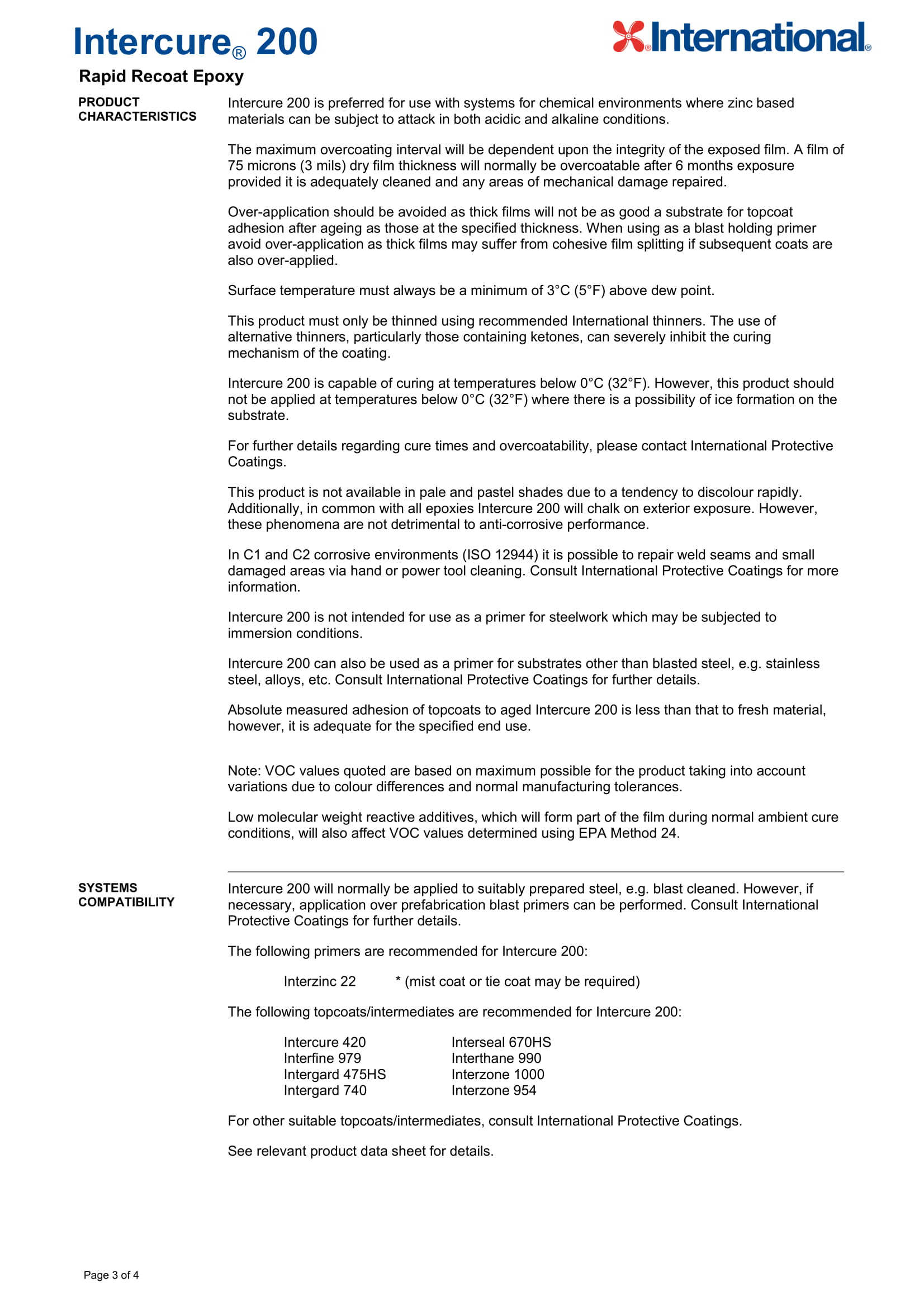 Sơn Intercure 200 là một loại sơn lót epoxy oxit kẽm kẽm / micaceous sắt hai thành phần, được chế tạo trên công nghệ polymer độc quyền, giúp xử lý nhanh và phủ lớp ngay cả trong điều kiện nhiệt độ thấp. Chất rắn cao, sản phẩm VOC thấp.