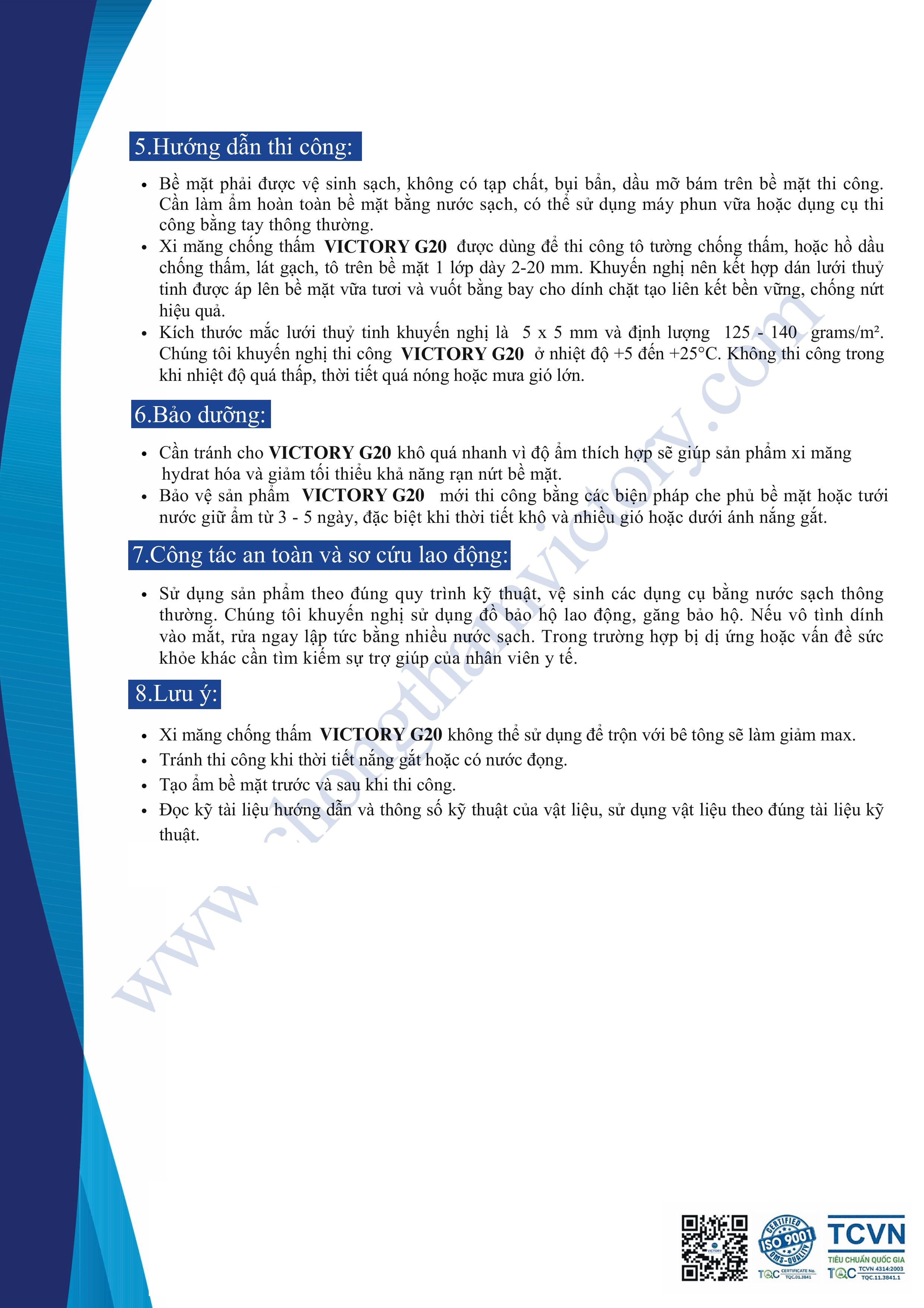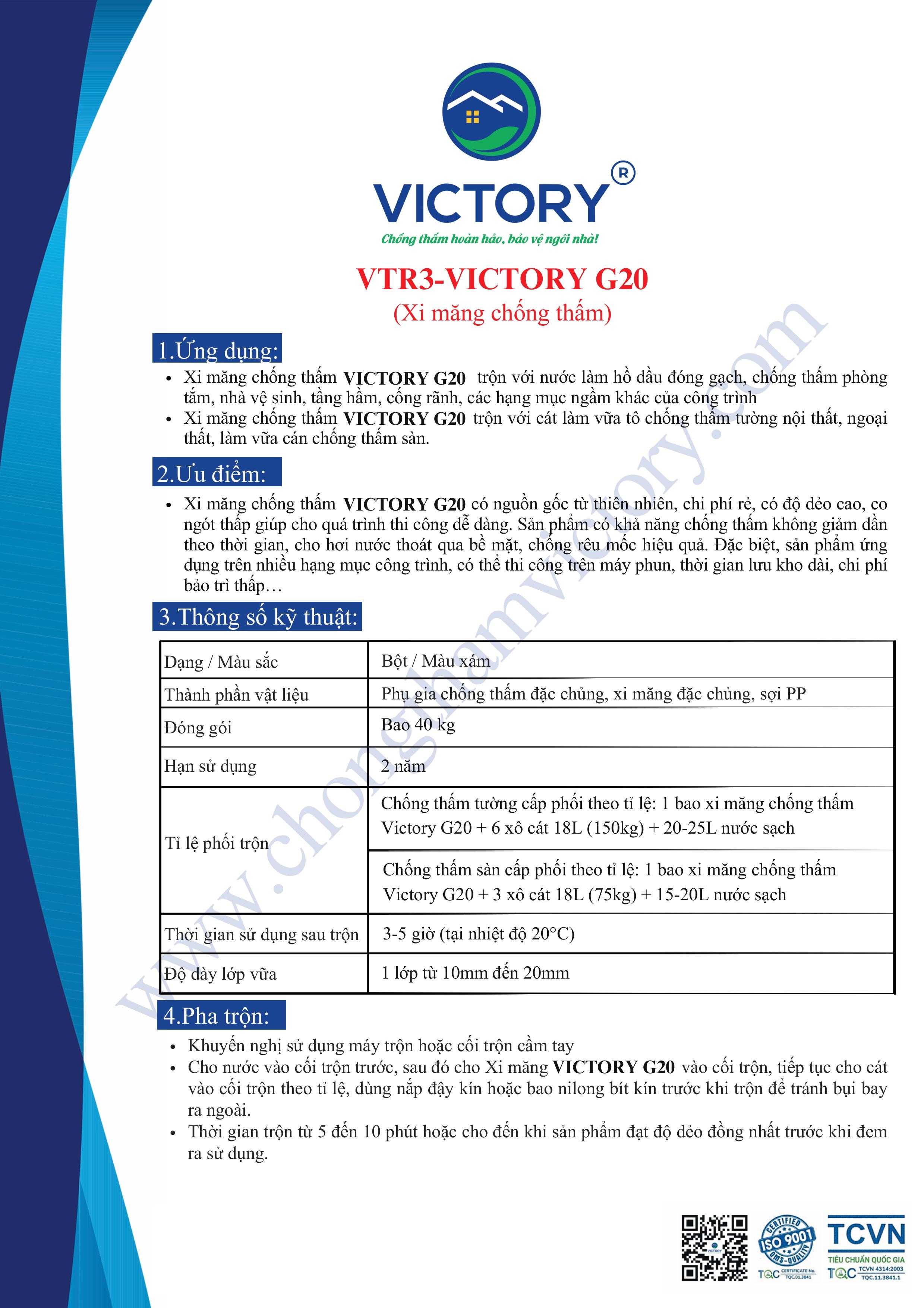 Xi măng chống thấm VICTORY G20 có nguồn gốc từ thiên nhiên, chỉ phí rẻ, có độ dẻo cao, co ngót thấp giúp cho quá trình thi công dễ dàng. Sản phẩm có khả năng chống thấm không giảm dần theo thời gian, cho hơi nước thoát qua bề mặt, chống rêu mốc hiệu quả. Đặc biệt, sản phẩm ứng dụng trên nhiều hạng mục công trình, có thể thi công trên máy phun, thời gian lưu kho dài, chỉ phí bảo trì thấp...